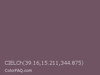 CIELCh 39.16,15.211,344.875 Color is a normal rose color and the nearest color is Scorpion #695f62. Hex code #715463 and RGB value is rgb(113,84,99). In RGB color space, this color is composed of 44% red, 33% green, 39% blue, In CMYK color space, this color is composed of 0% cyan, 26% magenta, 12% yellow , 56% black , In HSL color space, this color has a hue angle of 329° , 15% saturation and 39% lightness.