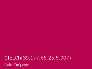 CIELCh 39.177,65.25,8.907 Color is a normal rose color and the nearest color is Pictorial Carmine #c30b4e. Hex code #b7064f and RGB value is rgb(183,6,79). In RGB color space, this color is composed of 72% red, 2% green, 31% blue, In CMYK color space, this color is composed of 0% cyan, 97% magenta, 57% yellow , 28% black , In HSL color space, this color has a hue angle of 335° , 94% saturation and 37% lightness.