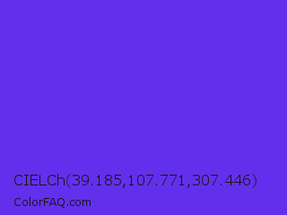 CIELCh 39.185,107.771,307.446 Color is a normal indigo color and the nearest color is Han Purple #5218fa. Hex code #6230ec and RGB value is rgb(98,48,236). In RGB color space, this color is composed of 38% red, 19% green, 93% blue, In CMYK color space, this color is composed of 58% cyan, 80% magenta, 0% yellow , 7% black , In HSL color space, this color has a hue angle of 256° , 83% saturation and 56% lightness.