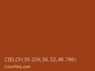 CIELCh 39.209,56.32,48.786 Color is a normal orange color and the nearest color is Cognac #9f381d. Hex code #9d3f16 and RGB value is rgb(157,63,22). In RGB color space, this color is composed of 62% red, 25% green, 9% blue, In CMYK color space, this color is composed of 0% cyan, 60% magenta, 86% yellow , 38% black , In HSL color space, this color has a hue angle of 18° , 75% saturation and 35% lightness.