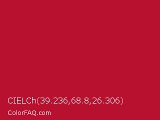 CIELCh 39.236,68.8,26.306 Color is a normal red color and the nearest color is Shiraz #b20931. Hex code #b8112f and RGB value is rgb(184,17,47). In RGB color space, this color is composed of 72% red, 7% green, 18% blue, In CMYK color space, this color is composed of 0% cyan, 91% magenta, 74% yellow , 28% black , In HSL color space, this color has a hue angle of 349° , 83% saturation and 39% lightness.