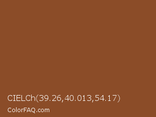 CIELCh 39.26,40.013,54.17 Color is a normal orange color and the nearest color is Mule Fawn #8c472f. Hex code #8b4c28 and RGB value is rgb(139,76,40). In RGB color space, this color is composed of 55% red, 30% green, 16% blue, In CMYK color space, this color is composed of 0% cyan, 45% magenta, 71% yellow , 45% black , In HSL color space, this color has a hue angle of 22° , 55% saturation and 35% lightness.