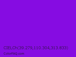 CIELCh 39.279,110.304,313.833 Color is a normal purple color and the nearest color is French Violet #8806ce. Hex code #860ce2 and RGB value is rgb(134,12,226). In RGB color space, this color is composed of 53% red, 5% green, 89% blue, In CMYK color space, this color is composed of 41% cyan, 95% magenta, 0% yellow , 11% black , In HSL color space, this color has a hue angle of 274° , 90% saturation and 47% lightness.