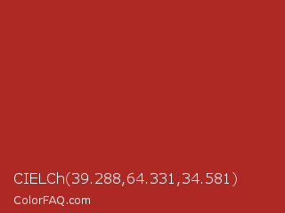 CIELCh 39.288,64.331,34.581 Color is a normal red color and the nearest color is Tall Poppy #b32d29. Hex code #af2924 and RGB value is rgb(175,41,36). In RGB color space, this color is composed of 69% red, 16% green, 14% blue, In CMYK color space, this color is composed of 0% cyan, 77% magenta, 79% yellow , 31% black , In HSL color space, this color has a hue angle of 2° , 66% saturation and 41% lightness.