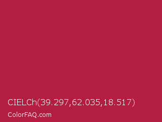 CIELCh 39.297,62.035,18.517 Color is a normal red color and the nearest color is French Wine #ac1e44. Hex code #b31d40 and RGB value is rgb(179,29,64). In RGB color space, this color is composed of 70% red, 11% green, 25% blue, In CMYK color space, this color is composed of 0% cyan, 84% magenta, 64% yellow , 30% black , In HSL color space, this color has a hue angle of 346° , 72% saturation and 41% lightness.