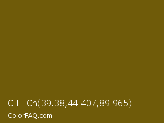 CIELCh 39.38,44.407,89.965 Color is a dark yellow color and the nearest color is Spicy Mustard #74640d. Hex code #6f5b09 and RGB value is rgb(111,91,9). In RGB color space, this color is composed of 44% red, 36% green, 4% blue, In CMYK color space, this color is composed of 0% cyan, 18% magenta, 92% yellow , 56% black , In HSL color space, this color has a hue angle of 48° , 85% saturation and 24% lightness.