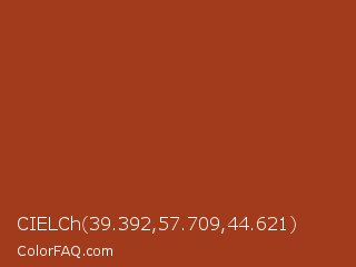 CIELCh 39.392,57.709,44.621 Color is a normal red color and the nearest color is Cognac #9f381d. Hex code #a23b1b and RGB value is rgb(162,59,27). In RGB color space, this color is composed of 64% red, 23% green, 11% blue, In CMYK color space, this color is composed of 0% cyan, 64% magenta, 83% yellow , 36% black , In HSL color space, this color has a hue angle of 14° , 71% saturation and 37% lightness.