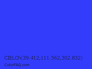 CIELCh 39.412,111.562,302.832 Color is a normal blue color and the nearest color is Palatinate Blue #273be2. Hex code #333cfb and RGB value is rgb(51,60,251). In RGB color space, this color is composed of 20% red, 24% green, 98% blue, In CMYK color space, this color is composed of 80% cyan, 76% magenta, 0% yellow , 2% black , In HSL color space, this color has a hue angle of 237° , 96% saturation and 59% lightness.