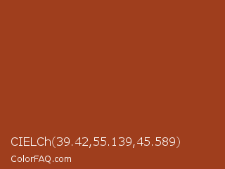 CIELCh 39.42,55.139,45.589 Color is a normal color and the nearest color is Cognac #9f381d. Hex code #9f3e1d and RGB value is rgb(159,62,29). In RGB color space, this color is composed of 62% red, 24% green, 11% blue, In CMYK color space, this color is composed of 0% cyan, 61% magenta, 82% yellow , 38% black , In HSL color space, this color has a hue angle of 15° , 69% saturation and 37% lightness.