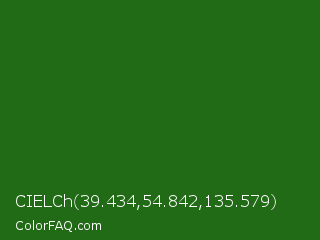 CIELCh 39.434,54.842,135.579 Color is a dark green color and the nearest color is Bilbao #327c14. Hex code #226b16 and RGB value is rgb(34,107,22). In RGB color space, this color is composed of 13% red, 42% green, 9% blue, In CMYK color space, this color is composed of 68% cyan, 0% magenta, 79% yellow , 58% black , In HSL color space, this color has a hue angle of 112° , 66% saturation and 25% lightness.