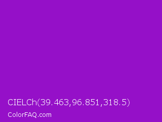 CIELCh 39.463,96.851,318.5 Color is a normal purple color and the nearest color is French Violet #8806ce. Hex code #9510c8 and RGB value is rgb(149,16,200). In RGB color space, this color is composed of 58% red, 6% green, 78% blue, In CMYK color space, this color is composed of 26% cyan, 92% magenta, 0% yellow , 22% black , In HSL color space, this color has a hue angle of 283° , 85% saturation and 42% lightness.