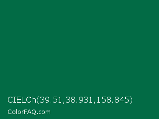 CIELCh 39.51,38.931,158.845 Color is a very dark green color and the nearest color is Cadmium Green #006b3c. Hex code #026b45 and RGB value is rgb(2,107,69). In RGB color space, this color is composed of 1% red, 42% green, 27% blue, In CMYK color space, this color is composed of 98% cyan, 0% magenta, 36% yellow , 58% black , In HSL color space, this color has a hue angle of 158° , 96% saturation and 21% lightness.