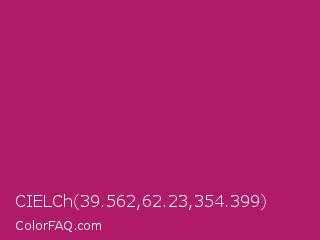 CIELCh 39.562,62.23,354.399 Color is a normal rose color and the nearest color is Jazzberry Jam #a50b5e. Hex code #b01a69 and RGB value is rgb(176,26,105). In RGB color space, this color is composed of 69% red, 10% green, 41% blue, In CMYK color space, this color is composed of 0% cyan, 85% magenta, 40% yellow , 31% black , In HSL color space, this color has a hue angle of 328° , 74% saturation and 40% lightness.