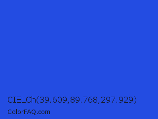 CIELCh 39.609,89.768,297.929 Color is a normal blue color and the nearest color is Palatinate Blue #273be2. Hex code #234ce2 and RGB value is rgb(35,76,226). In RGB color space, this color is composed of 14% red, 30% green, 89% blue, In CMYK color space, this color is composed of 85% cyan, 66% magenta, 0% yellow , 11% black , In HSL color space, this color has a hue angle of 227° , 77% saturation and 51% lightness.