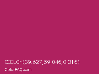 CIELCh 39.627,59.046,0.316 Color is a normal rose color and the nearest color is Rich Maroon #b03060. Hex code #af215f and RGB value is rgb(175,33,95). In RGB color space, this color is composed of 69% red, 13% green, 37% blue, In CMYK color space, this color is composed of 0% cyan, 81% magenta, 46% yellow , 31% black , In HSL color space, this color has a hue angle of 334° , 68% saturation and 41% lightness.