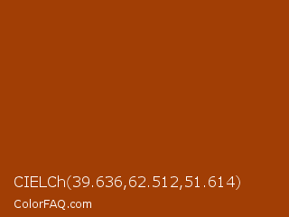 CIELCh 39.636,62.512,51.614 Color is a normal orange color and the nearest color is Fire #aa4203. Hex code #a13e05 and RGB value is rgb(161,62,5). In RGB color space, this color is composed of 63% red, 24% green, 2% blue, In CMYK color space, this color is composed of 0% cyan, 61% magenta, 97% yellow , 37% black , In HSL color space, this color has a hue angle of 22° , 94% saturation and 33% lightness.