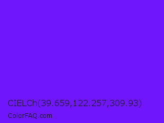 CIELCh 39.659,122.257,309.93 Color is a normal violet color and the nearest color is Electric Indigo #6f00ff. Hex code #7016fc and RGB value is rgb(112,22,252). In RGB color space, this color is composed of 44% red, 9% green, 99% blue, In CMYK color space, this color is composed of 56% cyan, 91% magenta, 0% yellow , 1% black , In HSL color space, this color has a hue angle of 263° , 97% saturation and 54% lightness.