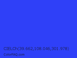 CIELCh 39.662,108.046,301.978 Color is a normal blue color and the nearest color is Palatinate Blue #273be2. Hex code #2f40f8 and RGB value is rgb(47,64,248). In RGB color space, this color is composed of 18% red, 25% green, 97% blue, In CMYK color space, this color is composed of 81% cyan, 74% magenta, 0% yellow , 3% black , In HSL color space, this color has a hue angle of 235° , 93% saturation and 58% lightness.