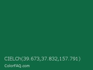 CIELCh 39.673,37.832,157.791 Color is a dark green color and the nearest color is Jewel #126b40. Hex code #106b45 and RGB value is rgb(16,107,69). In RGB color space, this color is composed of 6% red, 42% green, 27% blue, In CMYK color space, this color is composed of 85% cyan, 0% magenta, 36% yellow , 58% black , In HSL color space, this color has a hue angle of 155° , 74% saturation and 24% lightness.