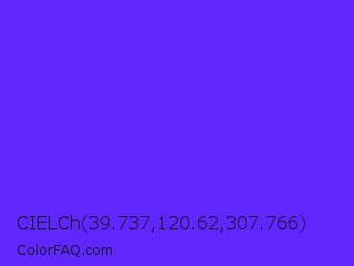 CIELCh 39.737,120.62,307.766 Color is a normal indigo color and the nearest color is Han Purple #5218fa. Hex code #6026ff and RGB value is rgb(96,38,255). In RGB color space, this color is composed of 38% red, 15% green, 100% blue, In CMYK color space, this color is composed of 62% cyan, 85% magenta, 0% yellow , 0% black , In HSL color space, this color has a hue angle of 256° , 100% saturation and 57% lightness.