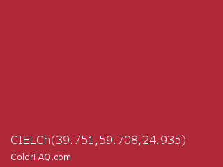 CIELCh 39.751,59.708,24.935 Color is a normal red color and the nearest color is Well Read #b43332. Hex code #b02938 and RGB value is rgb(176,41,56). In RGB color space, this color is composed of 69% red, 16% green, 22% blue, In CMYK color space, this color is composed of 0% cyan, 77% magenta, 68% yellow , 31% black , In HSL color space, this color has a hue angle of 353° , 62% saturation and 43% lightness.