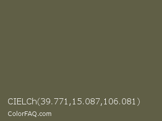 CIELCh 39.771,15.087,106.081 Color is a normal yellow color and the nearest color is Finch #626649. Hex code #605f46 and RGB value is rgb(96,95,70). In RGB color space, this color is composed of 38% red, 37% green, 27% blue, In CMYK color space, this color is composed of 0% cyan, 1% magenta, 27% yellow , 62% black , In HSL color space, this color has a hue angle of 58° , 16% saturation and 33% lightness.