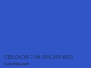 CIELCh 39.7,68.934,293.853 Color is a normal blue color and the nearest color is Cerulean Blue #2a52be. Hex code #3154c6 and RGB value is rgb(49,84,198). In RGB color space, this color is composed of 19% red, 33% green, 78% blue, In CMYK color space, this color is composed of 75% cyan, 58% magenta, 0% yellow , 22% black , In HSL color space, this color has a hue angle of 226° , 60% saturation and 48% lightness.