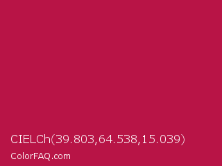 CIELCh 39.803,64.538,15.039 Color is a normal rose color and the nearest color is French Wine #ac1e44. Hex code #b81446 and RGB value is rgb(184,20,70). In RGB color space, this color is composed of 72% red, 8% green, 27% blue, In CMYK color space, this color is composed of 0% cyan, 89% magenta, 62% yellow , 28% black , In HSL color space, this color has a hue angle of 342° , 80% saturation and 40% lightness.