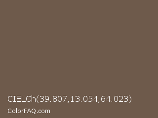CIELCh 39.807,13.054,64.023 Color is a normal orange color and the nearest color is Tobacco Brown #715d47. Hex code #6e5a4b and RGB value is rgb(110,90,75). In RGB color space, this color is composed of 43% red, 35% green, 29% blue, In CMYK color space, this color is composed of 0% cyan, 18% magenta, 32% yellow , 57% black , In HSL color space, this color has a hue angle of 26° , 19% saturation and 36% lightness.