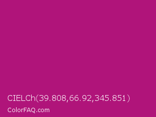 CIELCh 39.808,66.92,345.851 Color is a normal magenta color and the nearest color is Red Violet #c71585. Hex code #b0147a and RGB value is rgb(176,20,122). In RGB color space, this color is composed of 69% red, 8% green, 48% blue, In CMYK color space, this color is composed of 0% cyan, 89% magenta, 31% yellow , 31% black , In HSL color space, this color has a hue angle of 321° , 80% saturation and 38% lightness.