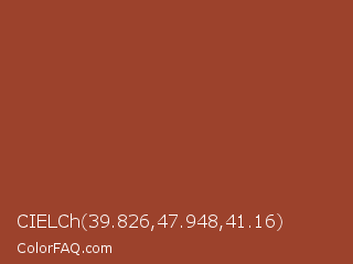 CIELCh 39.826,47.948,41.16 Color is a normal red color and the nearest color is Chestnut #954535. Hex code #9c422c and RGB value is rgb(156,66,44). In RGB color space, this color is composed of 61% red, 26% green, 17% blue, In CMYK color space, this color is composed of 0% cyan, 58% magenta, 72% yellow , 39% black , In HSL color space, this color has a hue angle of 12° , 56% saturation and 39% lightness.