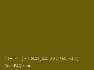 CIELCh 39.841,44.227,94.747 Color is a dark yellow color and the nearest color is Spicy Mustard #74640d. Hex code #6b5e0b and RGB value is rgb(107,94,11). In RGB color space, this color is composed of 42% red, 37% green, 4% blue, In CMYK color space, this color is composed of 0% cyan, 12% magenta, 90% yellow , 58% black , In HSL color space, this color has a hue angle of 52° , 81% saturation and 23% lightness.
