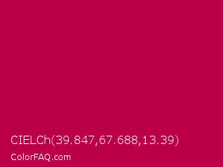 CIELCh 39.847,67.688,13.39 Color is a normal rose color and the nearest color is Pictorial Carmine #c30b4e. Hex code #bc0048 and RGB value is rgb(188,0,72). In RGB color space, this color is composed of 74% red, 0% green, 28% blue, In CMYK color space, this color is composed of 0% cyan, 100% magenta, 62% yellow , 26% black , In HSL color space, this color has a hue angle of 337° , 100% saturation and 37% lightness.