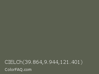 CIELCh 39.864,9.944,121.401 Color is a normal lime color and the nearest color is Ebony #555d50. Hex code #5b6050 and RGB value is rgb(91,96,80). In RGB color space, this color is composed of 36% red, 38% green, 31% blue, In CMYK color space, this color is composed of 5% cyan, 0% magenta, 17% yellow , 62% black , In HSL color space, this color has a hue angle of 79° , 9% saturation and 35% lightness.