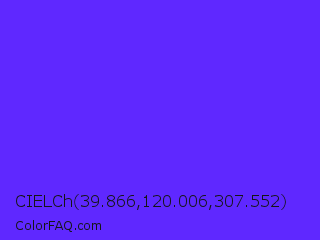 CIELCh 39.866,120.006,307.552 Color is a normal indigo color and the nearest color is Han Purple #5218fa. Hex code #5f28ff and RGB value is rgb(95,40,255). In RGB color space, this color is composed of 37% red, 16% green, 100% blue, In CMYK color space, this color is composed of 63% cyan, 84% magenta, 0% yellow , 0% black , In HSL color space, this color has a hue angle of 255° , 100% saturation and 58% lightness.