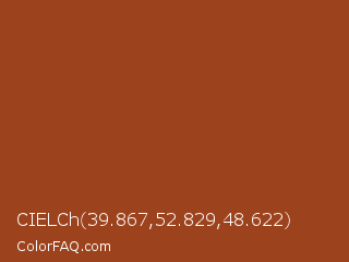 CIELCh 39.867,52.829,48.622 Color is a normal orange color and the nearest color is Cumin #924321. Hex code #9c431d and RGB value is rgb(156,67,29). In RGB color space, this color is composed of 61% red, 26% green, 11% blue, In CMYK color space, this color is composed of 0% cyan, 57% magenta, 81% yellow , 39% black , In HSL color space, this color has a hue angle of 18° , 69% saturation and 36% lightness.