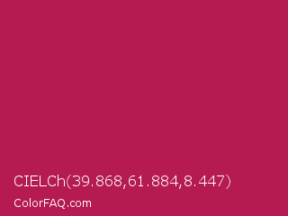 CIELCh 39.868,61.884,8.447 Color is a normal rose color and the nearest color is Rose Red #c21e56. Hex code #b51a52 and RGB value is rgb(181,26,82). In RGB color space, this color is composed of 71% red, 10% green, 32% blue, In CMYK color space, this color is composed of 0% cyan, 86% magenta, 55% yellow , 29% black , In HSL color space, this color has a hue angle of 338° , 75% saturation and 41% lightness.