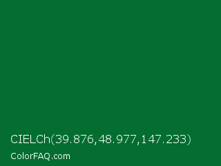CIELCh 39.876,48.977,147.233 Color is a very dark green color and the nearest color is Fun Green #016d39. Hex code #046d30 and RGB value is rgb(4,109,48). In RGB color space, this color is composed of 2% red, 43% green, 19% blue, In CMYK color space, this color is composed of 96% cyan, 0% magenta, 56% yellow , 57% black , In HSL color space, this color has a hue angle of 145° , 93% saturation and 22% lightness.