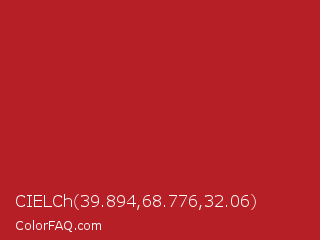 CIELCh 39.894,68.776,32.06 Color is a normal red color and the nearest color is Firebrick #b22222. Hex code #b71f26 and RGB value is rgb(183,31,38). In RGB color space, this color is composed of 72% red, 12% green, 15% blue, In CMYK color space, this color is composed of 0% cyan, 83% magenta, 79% yellow , 28% black , In HSL color space, this color has a hue angle of 357° , 71% saturation and 42% lightness.