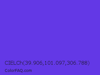 CIELCh 39.906,101.097,306.788 Color is a normal indigo color and the nearest color is Majorelle Blue #6050dc. Hex code #6338e6 and RGB value is rgb(99,56,230). In RGB color space, this color is composed of 39% red, 22% green, 90% blue, In CMYK color space, this color is composed of 57% cyan, 76% magenta, 0% yellow , 10% black , In HSL color space, this color has a hue angle of 255° , 78% saturation and 56% lightness.