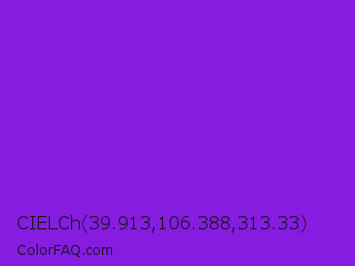 CIELCh 39.913,106.388,313.33 Color is a normal purple color and the nearest color is Blue Violet #8a2be2. Hex code #851ce0 and RGB value is rgb(133,28,224). In RGB color space, this color is composed of 52% red, 11% green, 88% blue, In CMYK color space, this color is composed of 41% cyan, 88% magenta, 0% yellow , 12% black , In HSL color space, this color has a hue angle of 272° , 78% saturation and 49% lightness.