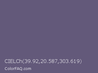 CIELCh 39.92,20.587,303.619 Color is a normal indigo color and the nearest color is Dolphin #646077. Hex code #63597a and RGB value is rgb(99,89,122). In RGB color space, this color is composed of 39% red, 35% green, 48% blue, In CMYK color space, this color is composed of 19% cyan, 27% magenta, 0% yellow , 52% black , In HSL color space, this color has a hue angle of 258° , 16% saturation and 41% lightness.