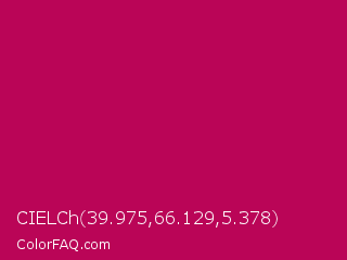 CIELCh 39.975,66.129,5.378 Color is a normal rose color and the nearest color is Pictorial Carmine #c30b4e. Hex code #ba0557 and RGB value is rgb(186,5,87). In RGB color space, this color is composed of 73% red, 2% green, 34% blue, In CMYK color space, this color is composed of 0% cyan, 97% magenta, 53% yellow , 27% black , In HSL color space, this color has a hue angle of 333° , 95% saturation and 37% lightness.