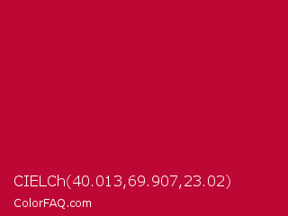 CIELCh 40.013,69.907,23.02 Color is a normal red color and the nearest color is Crimson Glory #be0032. Hex code #bd0836 and RGB value is rgb(189,8,54). In RGB color space, this color is composed of 74% red, 3% green, 21% blue, In CMYK color space, this color is composed of 0% cyan, 96% magenta, 71% yellow , 26% black , In HSL color space, this color has a hue angle of 345° , 92% saturation and 39% lightness.