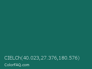 CIELCh 40.023,27.376,180.576 Color is a dark cyan color and the nearest color is Genoa #15736b. Hex code #146a5e and RGB value is rgb(20,106,94). In RGB color space, this color is composed of 8% red, 42% green, 37% blue, In CMYK color space, this color is composed of 81% cyan, 0% magenta, 11% yellow , 58% black , In HSL color space, this color has a hue angle of 172° , 68% saturation and 25% lightness.