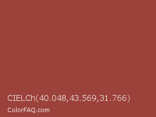 CIELCh 40.048,43.569,31.766 Color is a normal red color and the nearest color is Chestnut #954535. Hex code #9c423b and RGB value is rgb(156,66,59). In RGB color space, this color is composed of 61% red, 26% green, 23% blue, In CMYK color space, this color is composed of 0% cyan, 58% magenta, 62% yellow , 39% black , In HSL color space, this color has a hue angle of 4° , 45% saturation and 42% lightness.