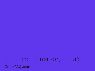 CIELCh 40.04,104.704,306.51 Color is a normal indigo color and the nearest color is Majorelle Blue #6050dc. Hex code #6037ec and RGB value is rgb(96,55,236). In RGB color space, this color is composed of 38% red, 22% green, 93% blue, In CMYK color space, this color is composed of 59% cyan, 77% magenta, 0% yellow , 7% black , In HSL color space, this color has a hue angle of 254° , 83% saturation and 57% lightness.