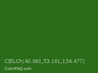 CIELCh 40.061,53.161,134.477 Color is a dark green color and the nearest color is Dell #396413. Hex code #2a6c19 and RGB value is rgb(42,108,25). In RGB color space, this color is composed of 16% red, 42% green, 10% blue, In CMYK color space, this color is composed of 61% cyan, 0% magenta, 77% yellow , 58% black , In HSL color space, this color has a hue angle of 108° , 62% saturation and 26% lightness.