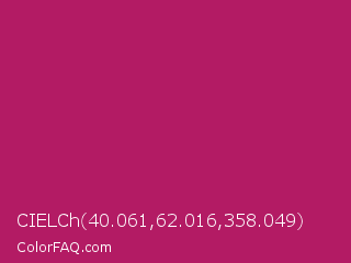 CIELCh 40.061,62.016,358.049 Color is a normal rose color and the nearest color is Rose Red #c21e56. Hex code #b31b64 and RGB value is rgb(179,27,100). In RGB color space, this color is composed of 70% red, 11% green, 39% blue, In CMYK color space, this color is composed of 0% cyan, 85% magenta, 44% yellow , 30% black , In HSL color space, this color has a hue angle of 331° , 74% saturation and 40% lightness.