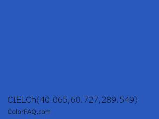 CIELCh 40.065,60.727,289.549 Color is a normal blue color and the nearest color is Cerulean Blue #2a52be. Hex code #2959bd and RGB value is rgb(41,89,189). In RGB color space, this color is composed of 16% red, 35% green, 74% blue, In CMYK color space, this color is composed of 78% cyan, 53% magenta, 0% yellow , 26% black , In HSL color space, this color has a hue angle of 221° , 64% saturation and 45% lightness.